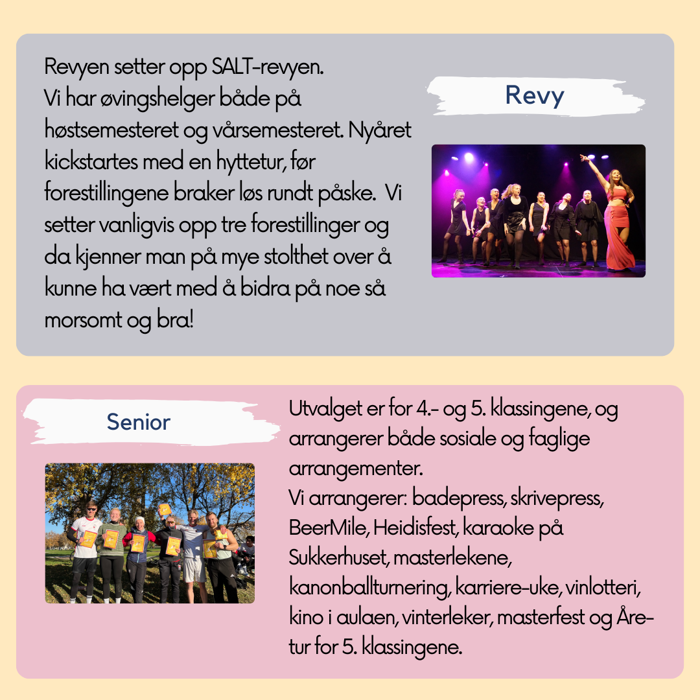 Ta gjerne også en titt på hva de ulike utvalgene driver med før du søker. Du kan ta en titt her, eller på instagramen vår @saltntnu, der alle utvalgene kommer til å dele hva de driver med gjennom de neste to ukene.