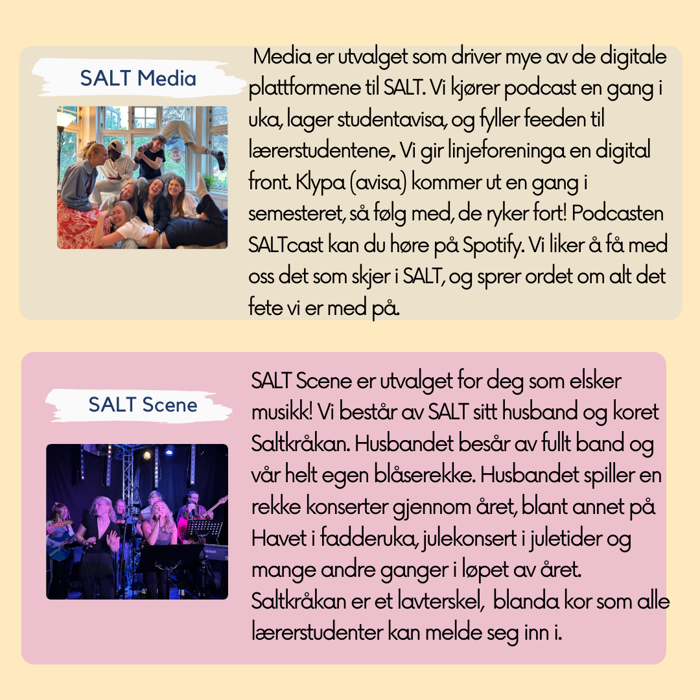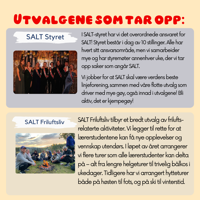 SALT er som dere vet linjeforeninga til alle grunnskolelærerstudenter i Trondheim. Som forening arrangeres det utallige arrangementer og aktiviteter for studentene, og vi er muligens den linjeforeninga med størst engasjement og mengde i aktiviteter vi tilbyr. Dette gjøres ikke av seg selv! Bak stort og smått som foregår, står det en gjeng med frivillige studenter som har vært kreative og planlagt, arrangert og promotert for det som skjer. Bak den store vinterturen vår til Åre står gjengen "Event" disse folka planlegger de store festene og arrangementene i SALT. Bak spillkveld på stuggu, Humlehagen og de gratis vaflene og bollene du kan få i gangen på Lysholm, står den fine gjengen "Stuggu". Alt det morsomme som skjer kun for 4. og 5. klassingene står det fine utvalget "Senior" for. Alt av idrett i SALT (og det er mye) skjer gjennom SALT IF, og artiklene dere kan lese her på nettsiden, og podcasten vår (som dere må høre om dere ikke allerde gjør det), drives av gjengen som kalles "Media". Det er totalt 12 grupper inkludert styret vårt, og alle disse gruppene gjør en fantastisk innsats for resten. Totalt er det i dag 170 stykker som driver studentmiljøet vårt, men vi søker flere!